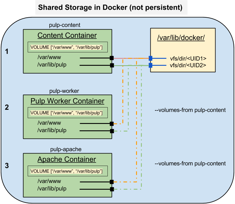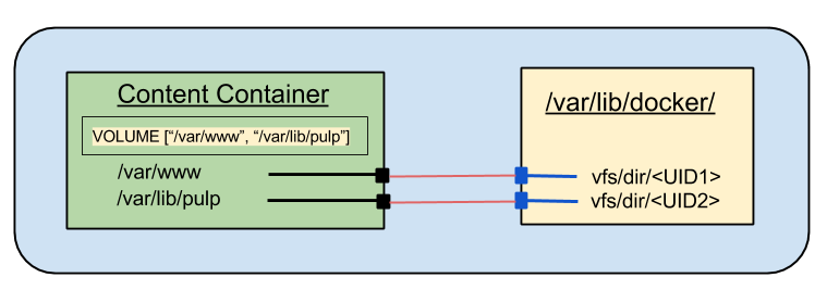 These are the volumes that are actually mounted on the container. I can see that /var/lib/pulp and /var/www have something mounted on them and that the volumes are actually stored in the host filesystem under /var/lib/docker/vfs/dir. Graphically, here's what that looks like: